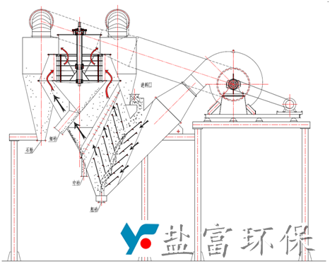 鹽富環(huán)保公司生產(chǎn)的YF-SF復(fù)合選粉機是將靜態(tài)的V型選粉機和內(nèi)循環(huán)高效渦流選粉機有機結(jié)合,可分級粒徑為4.75mm甚至 粒徑達(dá)10mm以上的物料。來料首先通過靜態(tài)的V選進(jìn)行粗細(xì)分離,中砂和細(xì)砂隨上升的氣流進(jìn)入高效渦流選粉機進(jìn)行分級,石粉則被旋風(fēng)筒收集。從老式的轉(zhuǎn)子選粉機只能對機制砂簡單脫粉到實現(xiàn)粗、中、細(xì)砂的 分級。